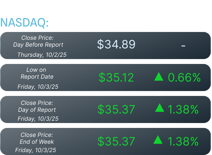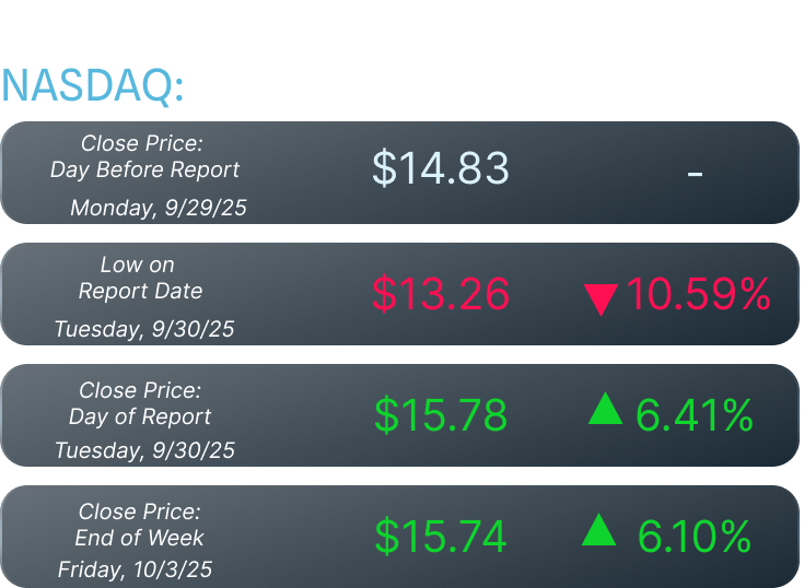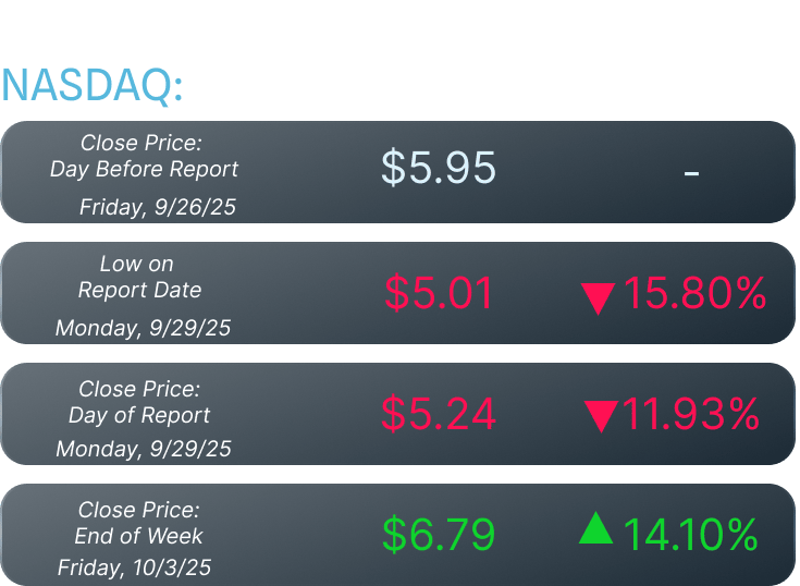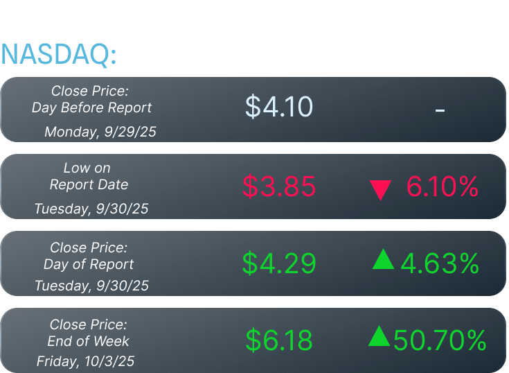 Capybara's extensive fraud allegations including embezzlement, criminal ties, and defective products initially pushed Richtech Robotics down 6% to an intraday low of $3.85 on September 30th from the $4.10 pre-report close. The stock then staged a massive short squeeze, closing up 5% at $4.29 before exploding 51% higher by week's end to $6.18, demonstrating how heavily shorted stocks can defy fundamental concerns when technical forces dominate.